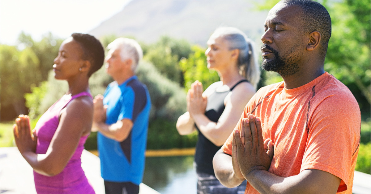 Group practicing breath-focused meditation outdoors for blood pressure control, embodying tranquility and collective wellness in serene weather.