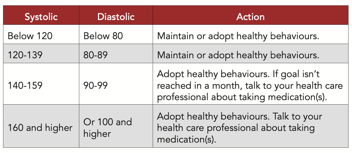These categories vary across different guidelines in different countries and there are some exceptions to the above categories. For example, if you have diabetes, your blood pressure should be less than 130/80 mmHg to reduce the risk of diabetic complications. As people age, the arteries become stiffer and blood pressure can increase naturally to an extent. Talk to your health care provider to determine what your target blood pressure is.