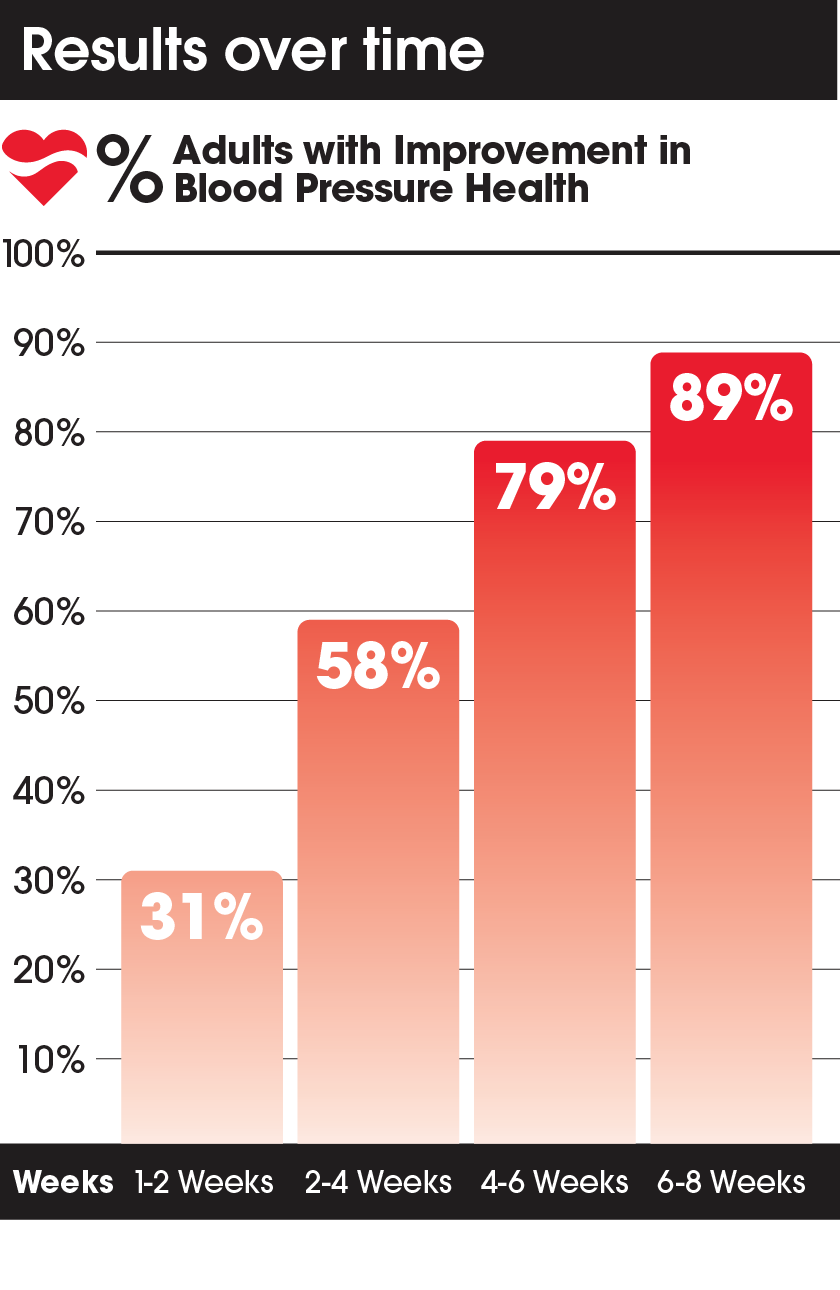 Allow 8 weeks (2 packs) to achieve results and continue to take daily to maintain results. Measure and monitor blood pressure regularly.